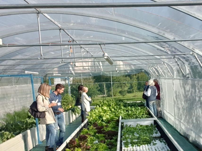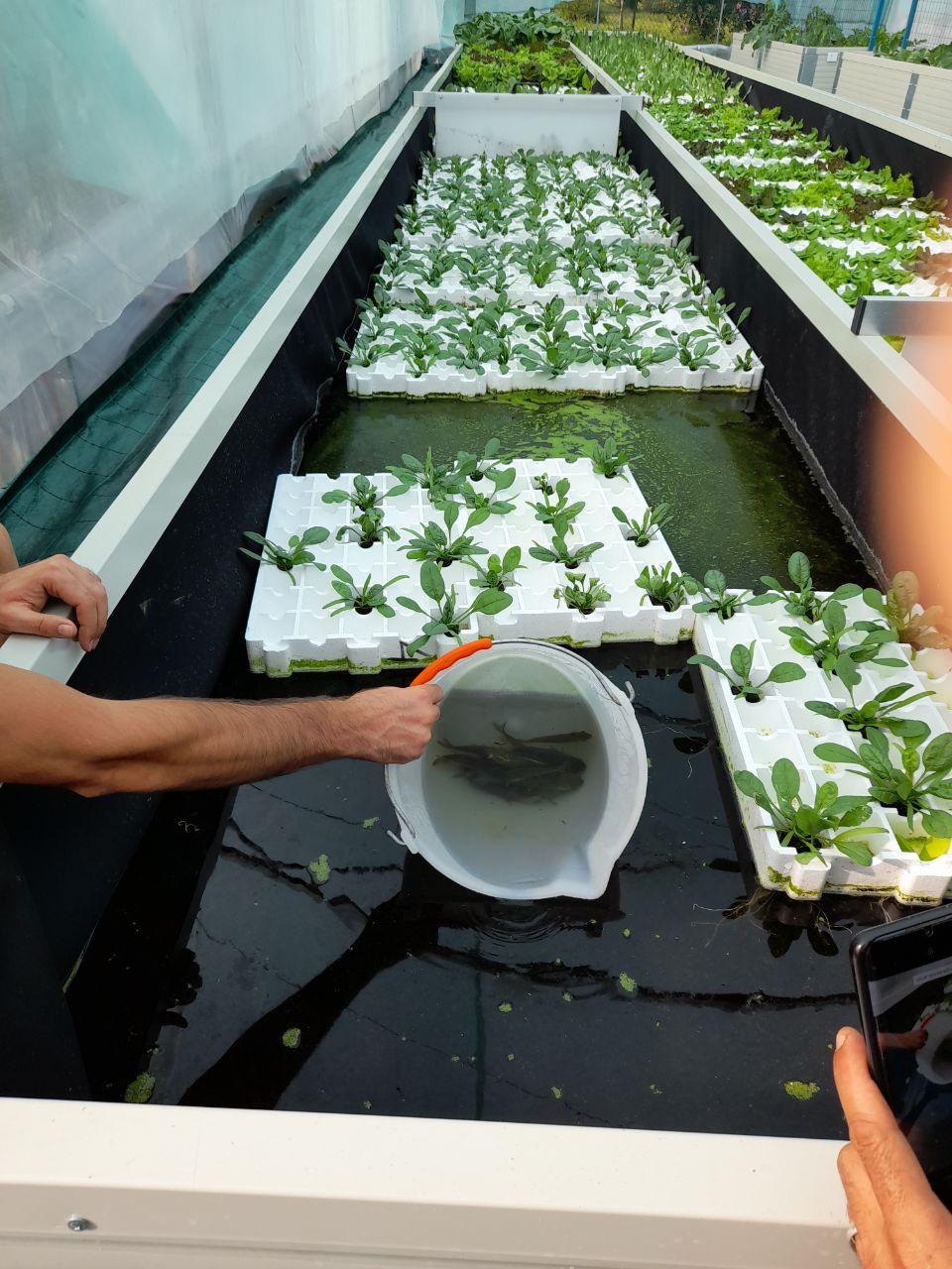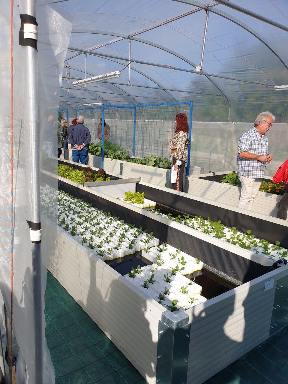 Ho intervistato la titolare d’azienda Gabriella che mi ha raccontato qualche curiosità per il suo sistema a scopo di vendita: le carpe mangiano oltre le radici dei vegetali, anche 1/2 gr di mangime naturale sotto forma di “pallina” che viene a galla in modo da poterlo monitorare. Se si cibano troppo può essere dannoso per loro. È necessario avere un pesce ogni metro quadrato. Questo impianto in serra non riscaldata è studiato per produrre circa nove raccolti all’anno poiché nella terra per le stesse colture ci vorrebbe circa un mese e mezzo. Qui in venti giorni si ottengono finocchi, barbabietole, insalata, broccoli….buonissimi e sani.